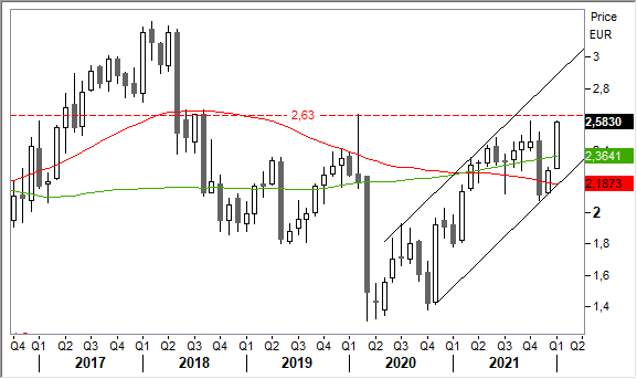 Graficamente, dai massimi pluriennali segnati oltre i 3,0 euro nel 2018, il movimento dei prezzi è stato caratterizzato da downtrend/uptrend ampi e alternati, ma con la direttrice portante verso il basso. Il tracollo (causa pandemia) dai massimi di inizio 2020 a 2,63 euro ha dimezzato la capitalizzazione sui minimi di marzo a 1,30 euro.
