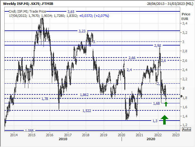 Graficamente, il rally che aveva spinto la quotazione sui top di periodo a 2,92 euro lo scorso febbraio è stato praticamente cancellato in tre settimane di crollo. Dai minimi di marzo, 1,68 euro, il rimbalzo è durato poco e i prezzi sono ritornati in quell'area. Il quadro di breve rimane vulnerabile, ma tutta la fascia 1,8-1,3 euro è di forte supporto e dal 2016 ha innescato rally potenti: top a 3,23 euro nel 2018, top a 2,66 euro nel 2020 e poi quello di febbraio.