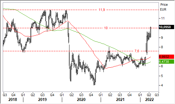 Graficamente, dai minimi toccati nel 2020 durante la prima fase della pandemia (4,38/4,0 euro) è in corso un progressivo recupero, che si è via via rafforzato negli ultimi mesi. Ci aspettiamo che la piena rottura di area 10,0 euro acceleri l'uptrend in direzione di zona 11,0/12,0 euro, top del 2019.