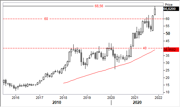 Graficamente, dai minimi di fine 2014 a 10 euro il movimento ascendente ha raggiunto quota 42,55 euro nel 2018. Successivamente, i prezzi hanno consolidato per circa 3 anni nella banda 25-43 euro prima di riprendere a spingere raggiungendo l'ultimo record storico a 68,56 euro l'8 novembre.