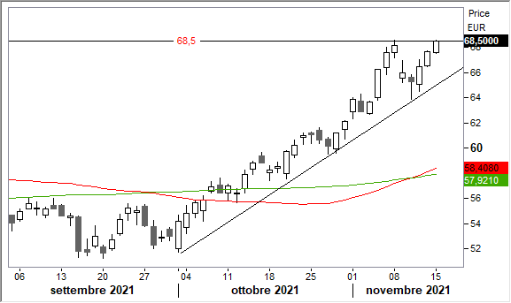 Operatività multiday. L'analisi Tecnica di Websim ha chiuso da poco una strategia Long. A questi livelli si può ancora vendere, pronti a rientrare in acquisto in caso di correzioni in area 60 euro. Sulla forza attendere la rottura di area 71 euro. Maggiori dettagli nella scheda tecnica.