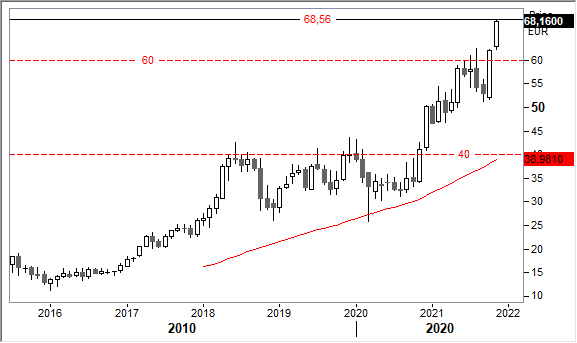 Graficamente, dai minimi di fine 2014 a 10 euro il movimento ascendente ha raggiunto quota 42,55 euro nel 2018. Successivamente, i prezzi hanno consolidato per circa 3 anni nella banda 25-43 euro prima di riprendere a spingere raggiungendo l'ultimo record storico a 68,56 euro l'8 novembre.
