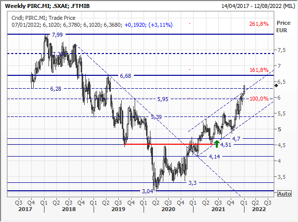 Con il rally degli ultimi trimestri, Pirelli ha sovraperformato il listino italiano e il settore di riferimento. Su un orizzonte di 12 mesi ha guadagnato il +49%, molto meglio del +25% registrato dal FtseMib e del +35% registrato dall'Eurostoxx Automotive. Sottoperforma invece la nostra borsa su orizzonti temporali più lunghi.
