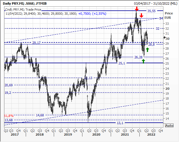 Graficamente, l'uptrend in corso dal 2009, avviato da 5,55 euro, ha segnato i massimi assoluti a 35,55 euro lo scorso novembre. Poi è seguito un veloce ritracciamento, -25%, che ha trovato base sulla fascia supportiva 26/25 euro, corrispondente al 38,2%-50% (percentuali di Fibonacci) del rialzo partito dai minimi del 2020 in zona 13 euro. Ci aspettiamo che i prezzi permangano ancora per diverso tempo nella banda 25/26 -34/35,5 euro.