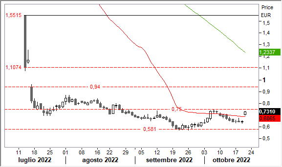 Operatività. Riprendiamo oggi la copertura del titolo con la scheda di Analisi Tecnica. Impostiamo acquisti alla prima chiusura sopra 0,75 euro per target di trading verso 0,94 euro. Sulla debolezza è opportuno intervenire verso 0,63 euro.