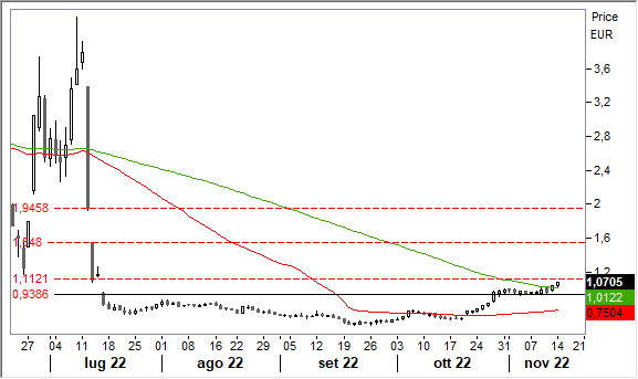 Operatività. Preso profitto in area 1,0 euro, è scattata una nuova strategia LONG con la chiusura sopra 1,03 euro, per target di trading verso 1,20 euro.