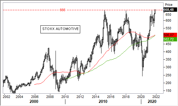 Graficamente, la tendenza di fondo dell'indice Stoxx Luxury è saldamente rialzista e le rare battute d'arresto sono servite a ricaricare le pile per successivi allunghi. Più complessa la tendenza del settore Automotive, che dal 2010 ad oggi ha vissuto ampi movimenti rialzisti/ribassisti con forte resistenza in area 666 punti, rotta ieri.