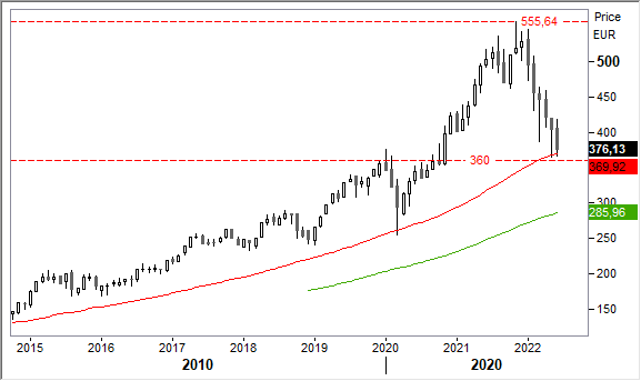 La correzione avviata dai top assoluti di fine 2021 è stata molto ampia (-33%) e si è appoggiata al primo importante sostegno di lungo periodo verso area 360 punti, dove si intersecano il supporto statico dell'ex massimo storico segnato nel 2020 e il supporto dinamico rappresentato dalla media mobile evidenziata in rosso. Questo livello potrebbe dare vita a una reazione o quantomeno a una fase di consolidamento.