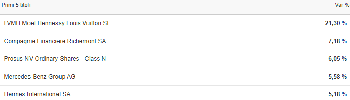 Obiettivo dell'ETF è la replica dell'indice MSCI Europe Consumer Discretionary. Questo indice rappresenta tutte le azioni europee che appartengono al settore dei "beni di consumo discrezionali" (esclusi gli Alimentari). Commissioni totali annue 0,30%. Non distribuisce dividendo. Nella tabella di seguito i primi cinque titoli in termini di peso specifico. Leggi il documento KID.