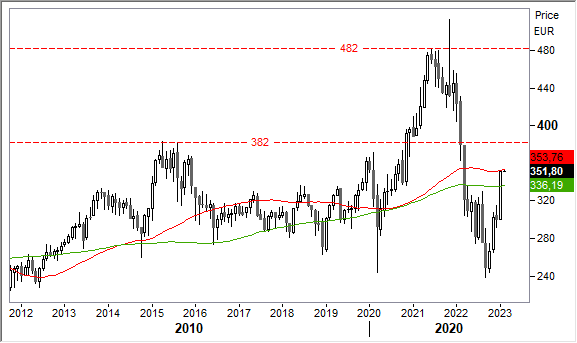 E' stata raggiunta negli ultimi giorni una prima area discriminante nel range 336/351 punti, la cui rottura dovrebbe consentire ulteriori allunghi verso la resistenza intorno a 382 punti. Oltre tale livello si può legittimamente puntare di nuovo ai top assoluti verso 482 punti.