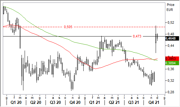 Operatività. Sfruttare il pull back in corso verso 0,47 euro per acquistare sulla debolezza. Primo target 0,55 euro. Stop loss alla prima chiusura sotto 0,39 euro.