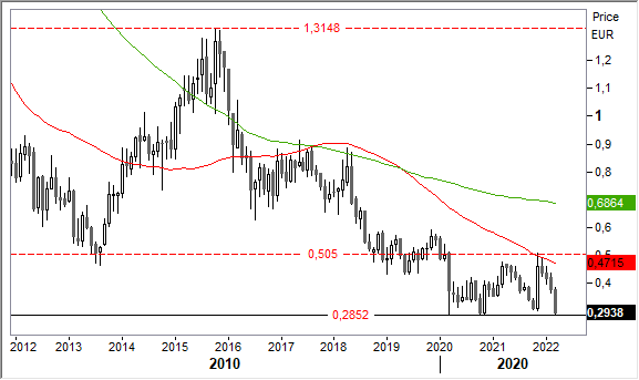 Graficamente, la tendenza di lungo periodo è fortemente ribassista. Il rimbalzo dai minimi della pandemia, toccati più volte in zona 0,30/0,285 euro, è stato effimero perchè non è riuscito a portarsi stabilmente sopra 0,50 euro, spartiacque per ambire ad un recupero più ambizioso e prolungato (verso 0,60/0,67 euro). Lo scivolone delle ultime sedute ha riportato il prezzo sui minimi storici del 2020, rivisti nel 2021.