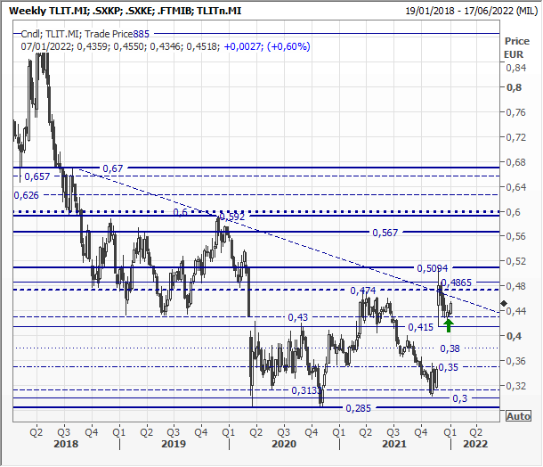 Il rimbalzo dai minimi della pandemia, toccati più volte in zona 0,3/0,285 euro, è stato effimero fino all'offerta del fondo KKR. Ma anche in questo caso non è riuscita a portarsi stabilmente sopra 0,50 euro, spartiacque per ambire ad un recupero più ambizioso e prolungato (0,60/0,67 euro). Ci attendiamo nuove spinte contro tali resistenze.