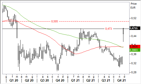 Operatività. Acquistare a prezzi di mercato e/o approfittando delle flessioni verso 0,40 euro. Pronti a incrementare alla prima chiusura sopra 0,48 euro. Target 0,55 euro.