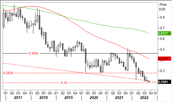 Graficamente, la tendenza di lungo periodo è strutturalmente ribassista. Il recente cedimento di area 0,22 euro ha aperto territori inesplorati con minimi difficilmente individuabili. Primo ostacolo a 0,28 euro circa. Area spartiacque al rialzo in zona 0,46/0,51 euro.