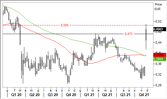 Operatività. La chiusura di mercoledì sopra 0,48 euro ha fatto anche scattare nuovi incrementi degli acquisti. Sfruttare eventuali pull back fino a 0,47 euro per acquistare sulla debolezza. Primo target 0,55 euro.