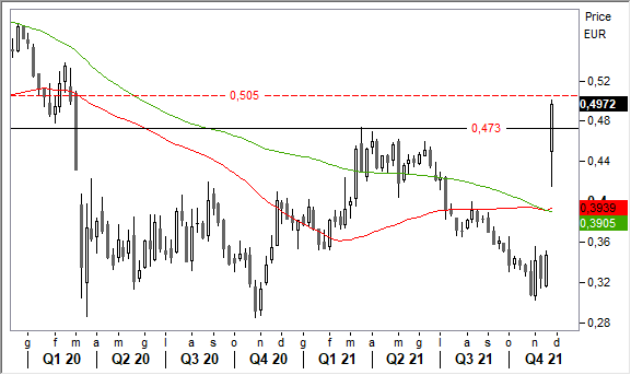 Operatività. La chiusura di ieri sopra 0,48 euro ha fatto anche scattare nuovi incrementi degli acquisti. Sfruttare eventuali pull back fino a 0,47 euro per acquistare sulla debolezza. Primo target 0,55 euro.