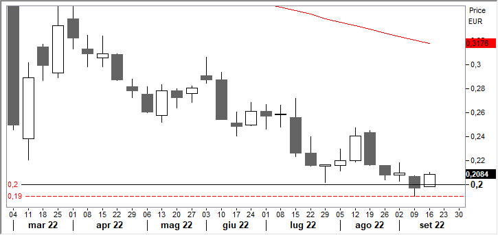 Graficamente, la tendenza di lungo periodo è strutturalmente ribassista. Il recente cedimento di area 0,22 euro ha aperto territori inesplorati con minimi difficilmente individuabili. Primo ostacolo a 0,28 euro circa. Area spartiacque al rialzo in zona 0,46/0,51 euro.