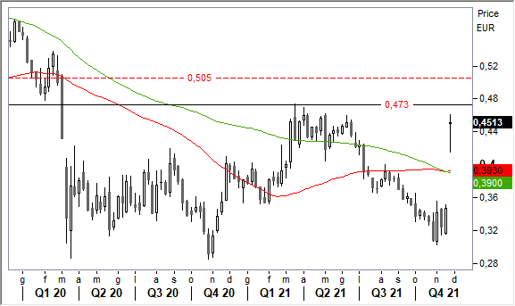 Operatività. Acquistare a prezzi di mercato e/o su flessioni verso 0,40 euro, stando pronti a incrementare alla prima chiusura sopra 0,48 euro. Primo target 0,55 euro.
