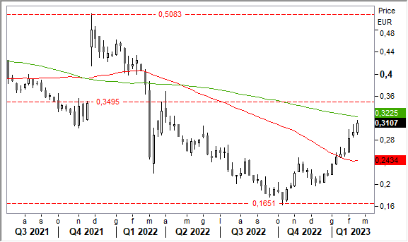 Graficamente, la tendenza di fondo è ancora fortemente ribassista ma si intravede qualche segnale positivo. La prolungata fase di accumulo nella banda 0,16-0,25 euro ha reso il terreno propizio per un rally dalle buone potenzialità.