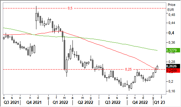 Graficamente, la tendenza di fondo è ancora fortemente ribassista, ma il deciso rimbalzo di ottobre/novembre ha prodotto ieri il primo risultato positivo, andando a rompere le importanti resistenze in area 0,25 euro. Una conferma del segnale a fine settimana darebbe maggior consistenza al movimento rialzista con target successivo almeno in zona 0,30 euro.
