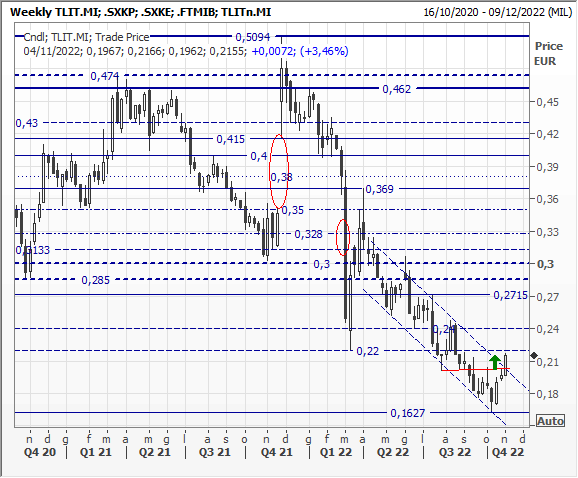 Graficamente, la tendenza è ancora fortemente ribassista. Difficile dire se il minimo toccato ad ottobre a 0,1627 euro possa diventare un minimo assoluto o solo un minimo provvisorio in grado di resistere per qualche tempo. Il rally avviato da quel livello potrebbe infatti rivelarsi un semplice rimbalzo (obiettivo di breve nella fascia 0,24-0,27 euro), ma il potenziale upside di medio-lungo periodo giustifica ancora qualche acquisto speculativo.