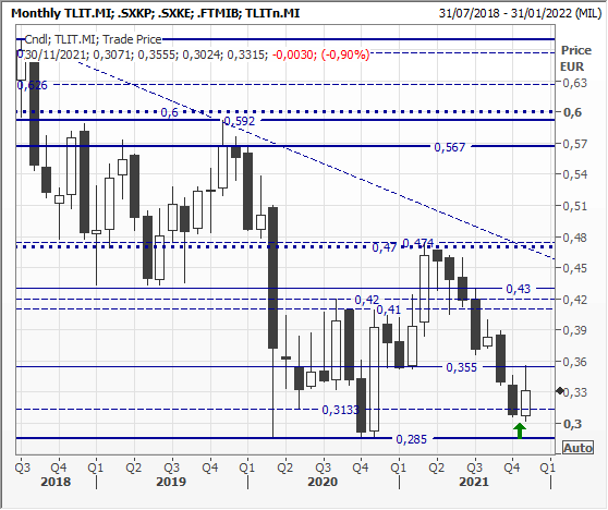 Graficamente, la tendenza di lungo periodo è fortemente ribassista. Nel pieno della bolla internet del marzo 2000 la quotazione arrivò fino a 9,50 euro, poi partì un downtrend più che ventennale. Il rimbalzo dai minimi della pandemia, in zona 0,285 euro, è stato effimero (massimo a 0,474 euro a marzo di quest'anno) così le quotazioni sono tornate al livello di partenza.