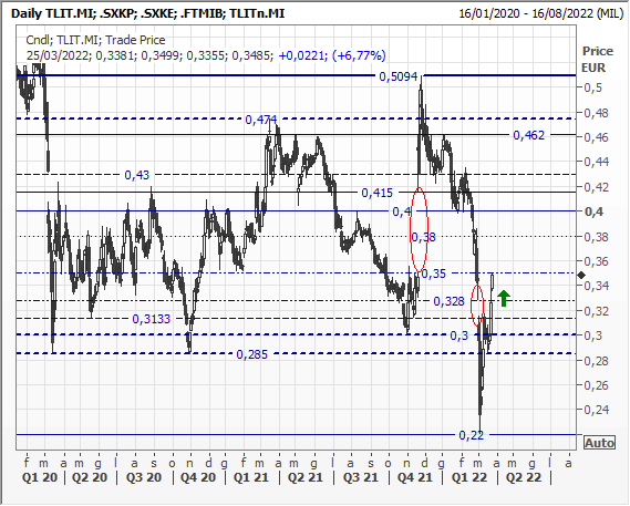 Graficamente, la tendenza di lungo periodo è fortemente ribassista. Nel pieno della bolla internet del marzo 2000 la quotazione arrivò fino a 9,50 euro. Da quel livello è partito un downtrend più che ventennale. Il rimbalzo dai minimi della pandemia, toccati più volte in zona 0,30/0,285 euro, è stato effimero fino all'offerta del fondo KKR. Ma anche in questo caso la reazione non è riuscita a portarsi stabilmente sopra 0,50 euro, spartiacque per ambire ad un recupero più ambizioso e prolungato (0,60/0,67 euro). Anzi, i prezzi sono crollati su nuovi minimi (0,22 euro): per ricucire il quadro è importante vedere chiusure di mese/trimestre sopra 0,285/0,3 euro, situazione che si sta concretizzando.