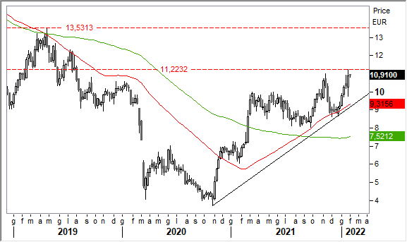 Il rally partito dai minimi del 2020 ha riportato la quotazione sui livelli pre-pandemia del 2019 ed è anche riuscito a superare l'importante scoglio grafico intorno ai 10 euro, spartiacque per puntare almeno ad area 12,50/13,50 euro.