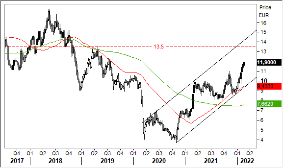Graficamente, se escludiamo il picco al rialzo del 2008 a 22,46 euro e quello al ribasso (causa pandemia) del 2020 a 3,76 euro, i prezzi si sono mossi dal 2006 nell'ampia banda 6,0/8,0 - 15,0/17,60 euro. Il recente superamento di area 11,0 euro ha rafforzato il rally partito dai minimi del 2020 e ha completato un modello rialzista che proietta target sulla parte alta della banda di medio-lungo periodo.