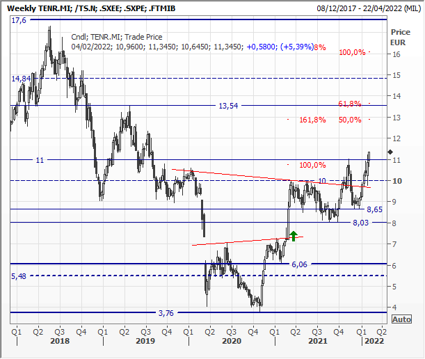 Graficamente, se escludiamo il picco al rialzo del 2008 a 22,46 euro e quello al ribasso (causa pandemia) del 2020 a 3,76 euro, i prezzi si muovono dal 2006 nella banda 6,0/8,0 - 15,0/17,60 euro. Il superamento di area 11,0 euro rafforza il rally partito dai minimi del 2020 e completa un modello rialzista che proietta target sulla parte alta della banda di medio-lungo periodo.
