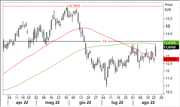 La brusca correzione partita dai top annuali sembra aver trovato solido supporto in area 11 euro. Rinnovati segnali di spinta arriveranno con una chiusura sopra 14 euro, ovvero al superamento della media mobile a 100 giorni.