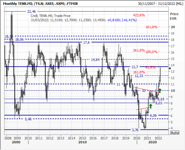 Graficamente, se escludiamo il picco al rialzo del 2008 a 22,46 euro e quello al ribasso (causa pandemia) del 2020 a 3,76 euro, i prezzi si muovono dal 2006 nella banda 6,0/8,0 - 15,0/17,60 euro. Il superamento di area 10 euro ha completato un modello rialzista che proietta target sulla parte alta della banda di medio-lungo periodo. Prossimo spartiacque di breve in zona 14 euro.