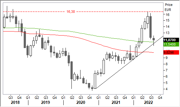 La brusca correzione partita dai top annuali sembra aver trovato solido supporto a ridosso della trendline crescente sotto indicata. Rinnovati segnali di spinta arriveranno con una chiusura sopra 12 euro.
