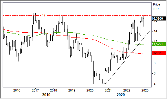 Sul titolo il consenso aggiornato pubblicato da Bloomberg registra 13 Buy, 3 Hold, 1 Sell. Prezzo obiettivo medio di 20,92 euro.