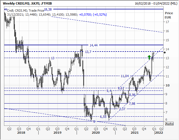 Graficamente, dai minimi assoluti del marzo 2020 segnati a 6 euro è in corso una energica fase ricostruttiva che punta i livelli pre-pandemia intorno a 14,0/14,40 euro, spartiacque grafico da superare per ambire al ritorno sui massimi del 2016/2017 in zona 18/20 euro. L'uscita dal canale crescente sotto evidenziato rappresenta un ulteriore segnale di forza del trend.