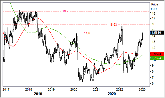Graficamente, il bel recupero avviato dai minimi di settembre segnati in area 9,0 euro sta riprendendo vigore, dopo una fisiologica pausa di assestamento, e sembra proiettato sulla successiva area di resistenza intorno ai 16 euro.