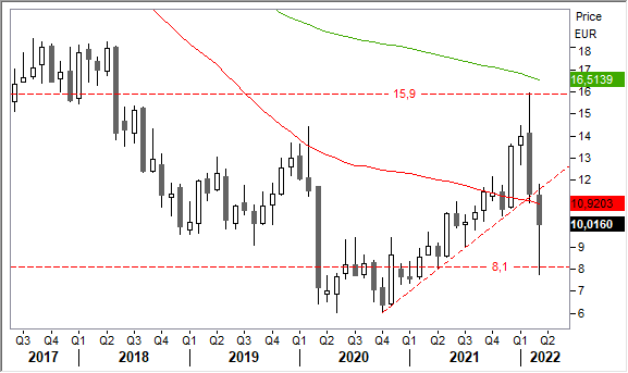 Graficamente, il rally che aveva spinto la quotazione sui top di periodo a 15,93 euro lo scorso febbraio è stato praticamente cancellato in tre settimane di crollo. I minimi di ieri a 7,75 euro hanno rivisto una forte fascia di supporto, compresa nel range 8,0-6,0 euro, innescando una prima energica reazione. Segnali di inversione si vedrebbero con il ritorno stabie sopra 10,0 euro.