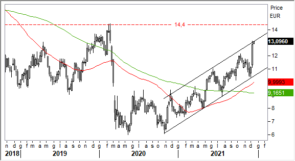 Graficamente, dai minimi assoluti del marzo 2020 segnati a 6 euro è in corso una fase ricostruttiva che non è ancora riuscita a riportare le quotazioni sui livelli pre-pandemia intorno a 14,40 euro. Una conferma dei segnali di spinta è giunta con la chiusura di venerdì sopra 12 euro. Dovrebbe anche cambiare in meglio il ritmo di risalita (con l'uscita dal canale crescente sotto evidenziato) favorendo il rapido ritorno sui livelli pre-pandemia.