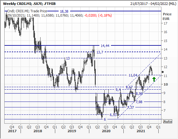 Graficamente, dai minimi assoluti del marzo 2020 segnati a 6 euro è in corso una fase ricostruttiva che, per ora, non è riuscita a riportare le quotazioni sui livelli pre-pandemia intorno a 14,40 euro. Ci aspettiamo che il trend prosegua, seppure intervallato da fisiologici momenti di pausa. Prossime conferme di forza sopra 12 euro.