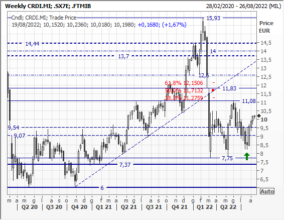 Graficamente, il rally che aveva spinto la quotazione sui top di periodo a 15,93 euro lo scorso febbraio è stato praticamente cancellato in tre settimane di crollo. I minimi segnati a 7,75 euro hanno rivisto, e sentito, una forte fascia di supporto, compresa nel range 8,0-6,0 euro: da quell'area sono partite più volte energiche reazioni. Segnali di forza più espliciti arriveranno sopra 11 eu.