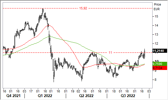 Graficamente, il rally che aveva spinto la quotazione sui top di periodo a 15,93 euro lo scorso febbraio è stato praticamente cancellato in tre settimane di crollo, a seguito dello scoppio del conflitto in Ucraina. I minimi successivi hanno trovato una forte fascia di supporto, compresa nel range 9,0-8,0 euro: da quell'area sono partite più volte energiche reazioni. Segnali di forza più espliciti arriveranno sopra 11 euro.