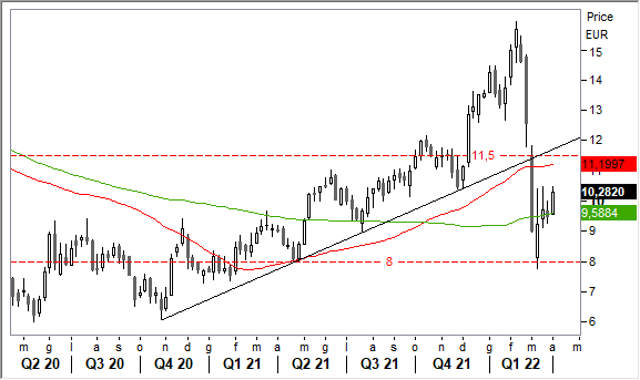 Difficile dire se è già partita l'inversione del trend, anche se da qualche giorno sembra in formazione un flag rialzista. Segnali in tal senso richiederanno maggiori conferme: almeno il superamento di 10,40/11,50 euro.