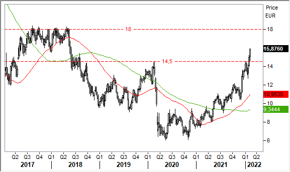 Graficamente, dai minimi assoluti del marzo 2020 segnati a 6 euro è in corso una energica fase ricostruttiva che ha "fatto saltare" con determinazione la resistenza posizionata sui livelli pre-pandemia intorno a 14,50 euro, spartiacque grafico da superare per ambire al ritorno sui massimi del 2016/2017 in zona 18/20 euro.