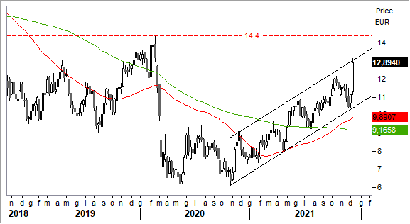 Graficamente, dai minimi assoluti del marzo 2020 segnati a 6 euro è in corso una fase ricostruttiva che non è ancora riuscita a riportare le quotazioni sui livelli pre-pandemia intorno a 14,40 euro. Una conferma dei segnali di spinta è giunta con la chiusura di ieri sopra 12 euro. La brusca accelerazione potrebbe anche cambiare in meglio il ritmo di risalita (con l'uscita dal canale crescente sotto evidenziato) e favorire il rapido ritorno sui livelli pre-pandemia. Comprensibile quindi l'assestamento di fine seduta.