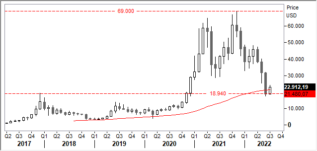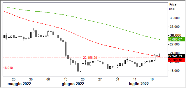 Operatività. Scattati acquisti speculativi alla chiusura sopra 22mila per primo target verso 25mila/25.500 usd e target finale verso 28mila/28.800 usd. Eventuali pull back verso area 22mila sono occasioni d'acquisto. Stop loss alla prima chiusura sotto 21.500 usd per riposizionarsi sui minimi dell'anno a 17mila usd.