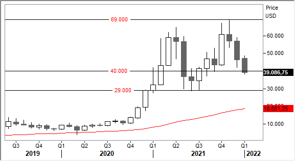 Graficamente, dal record storico di novembre (69mila usd) il Bitcoin ha avviato una profonda fase correttiva, che non si è ancora esaurita. Area 40mila usd ha provato a fare da argine alle vendite, ma la violenta accelerazione ribassita di ieri ha fatto saltare il supporto, aprendo la strada a ulteriori potenziali discese. Un chiusura di seduta/settimana sotto 40mila usd potrebbe favorire infatti una estensione della correzione fin verso area 30mila/29mila usd.