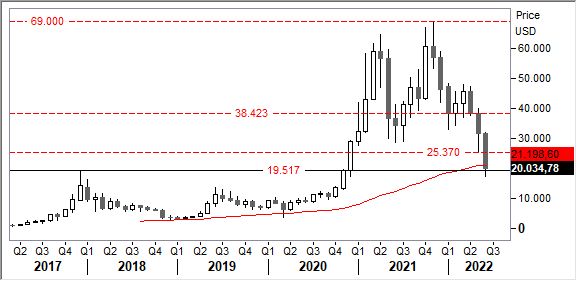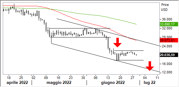 Operatività. Si può ancora azzardare un acquisto in ottica puramente speculativa verso area 21/20mila usd in vista di una reazione, fissando però obiettivi di trading ravvicinati intorno a 25mila usd. Se a fine mese il prezzo di Bitcoin sarà sotto i 20mila usd è preferibile chiudere la posizione perchè aumenterà il rischio di assistere a quello che in gergo si definisce "sciacquone finale".