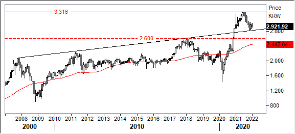 Quadro grafico Indice KOSPI. Il trend di fondo è saldamente rialzista. Toccato il nuovo record storico a 3.316 punti lo scorso 25 giugno, grazie a ben quindici mesi positivi di seguito, il trend ha avviato una fisiologica fase di assestamento. La tenuta della trendline crescente sotto evidenziata predispone il terreno per nuovi allunghi. Segnali di ripartenza troverebbero conferma con la risalita stabile sopra 3mila punti. Allerta e rischio di inversione della tendenza rialzista sotto 2.600 punti.