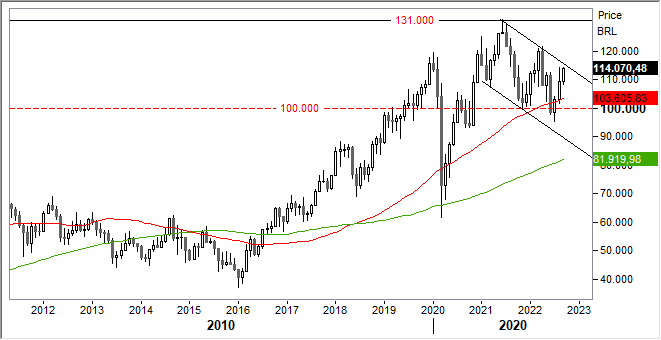 Operatività. Siamo ottimisti sulle prospettive di lungo periodo della borsa. Sfruttare lo scenario per costruire posizioni di lungo periodo: si può accompagnare il movimento con acquisti, anche a prezzi di mercato, stando pronti a incrementare sulla forza alla prima chiusura sopra 114mila punti sul primo grafico. Il target naturale è in direzione dei top assoluti. Stoppare prudenzialmente in caso di discesa sotto 100mila punti.